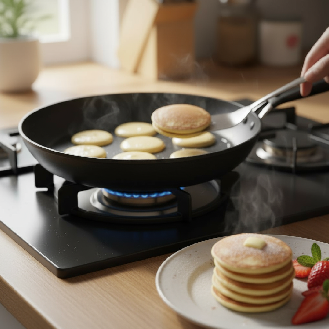 Heat a non-stick pan and pour batter into small rounds. Flip when bubbles form and cook until golden. Serve warm.