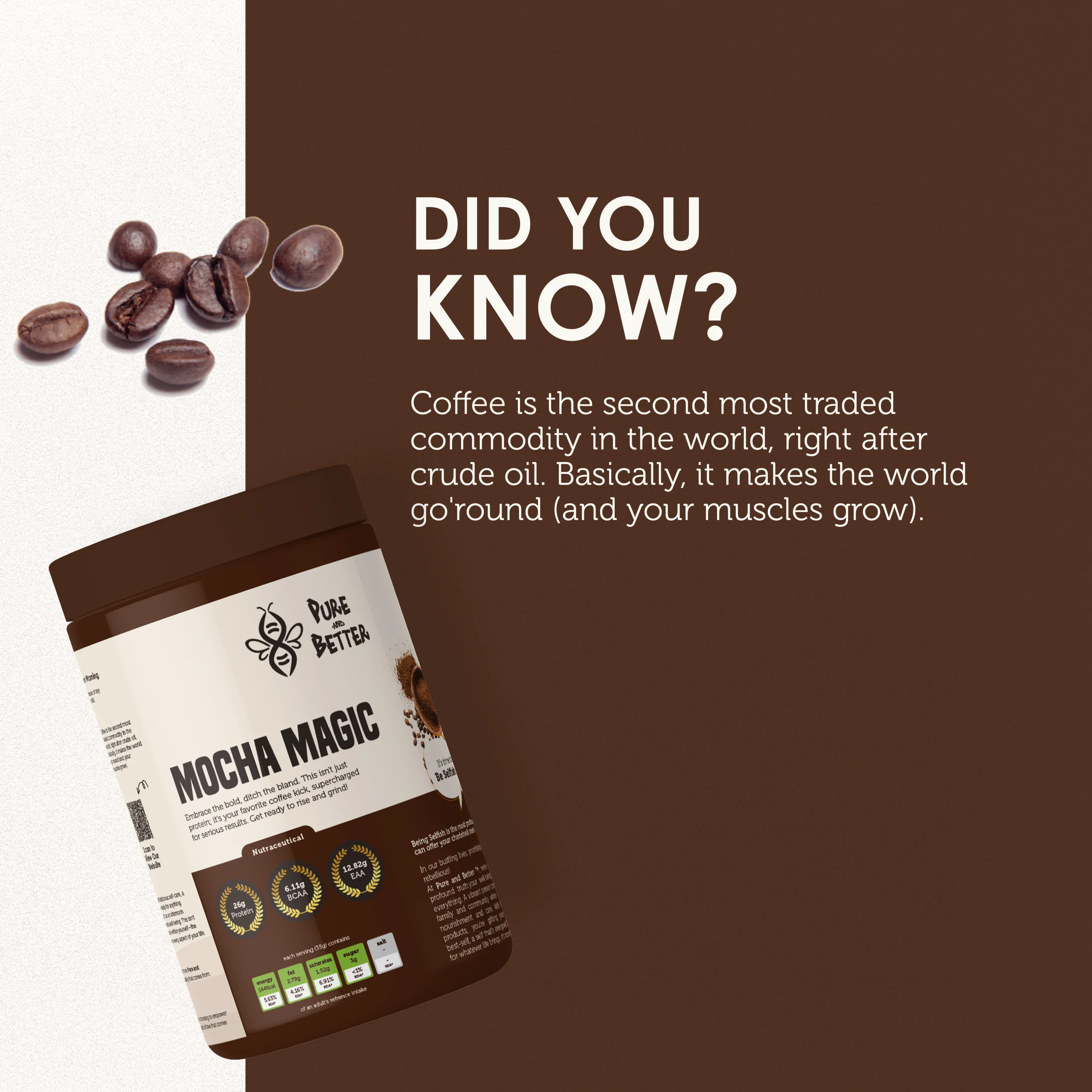 Your Mornings Just Got Jacked. Embrace the bold, Ditch the bland. This isn’t just protein; it’s your favorite coffee kick Mocha Magic, supercharged for serious results. Get ready to rise and grind!
