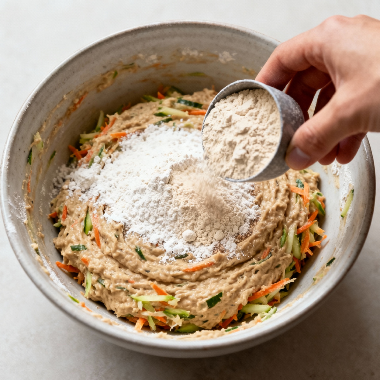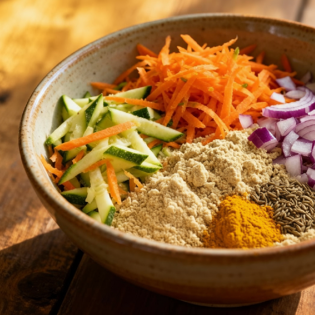 In a bowl, mix grated veggies, chickpea flour, onion, and spices.
