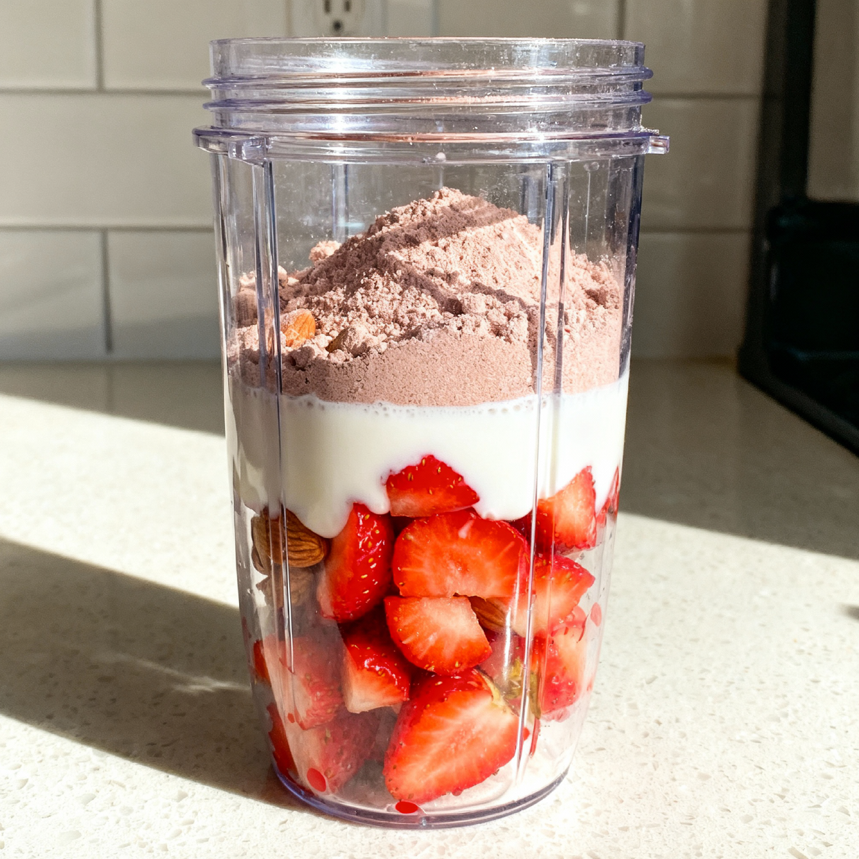 In a blender, combine the almond milk, crunchberry protein powder, and chopped strawberries.